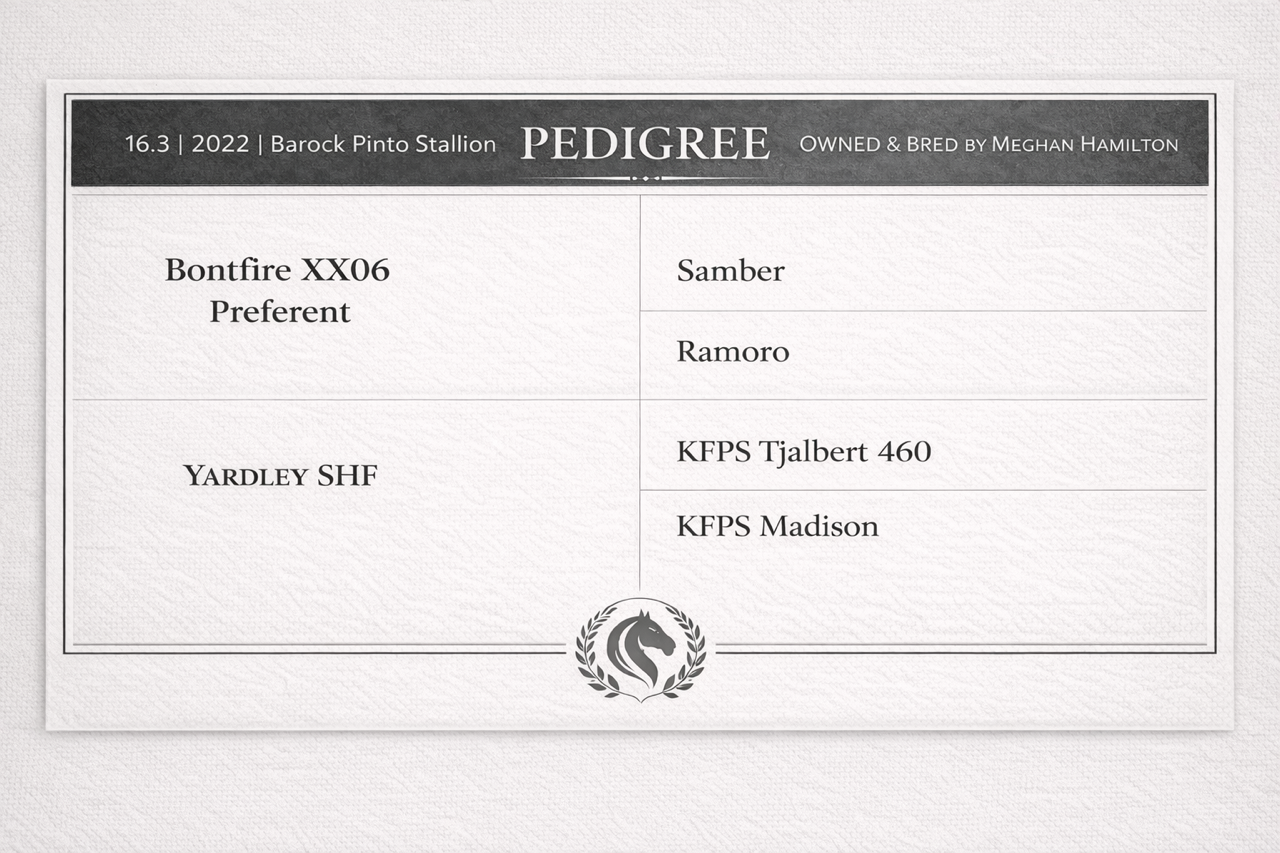 Bontfire XX06 Preferent has carried this legacy forward with remarkable consistency. His offspring are internationally recognized for their large, correct frames, expressive movement, strong work ethic, kind temperament, and reliable pinto coloring. His genetic impact continues to expand through licensed sons and grandsons worldwide, including record-setting stallions such as Ivano BP65, the highest-scoring Barock Pinto Studbook stallion of all time.